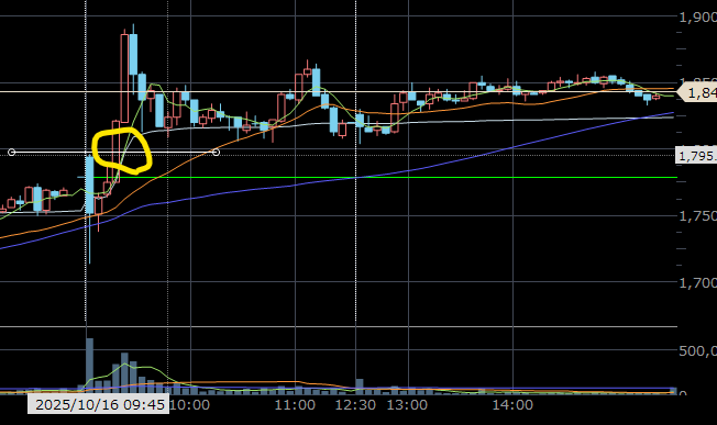 9:15に始値を更新したところ(下記画像の黄色い丸)
